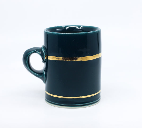 This americano mug will bring elegance and fun to your coffee routine. I threw the cup on the potter's wheel in porcelain. I glazed it in a food safe glaze, and finished it with 22K gold luster decals.