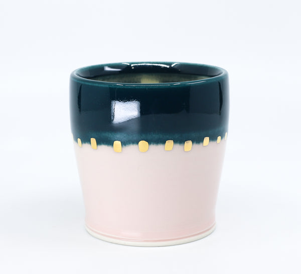 This is your perfect everyday cup for tea, juice, or a cocktail! I threw this cup on the wheel in porcelain, glazed it in a food safe glaze, and decorated it with 22K gold luster decals. It holds approximately 8 oz.