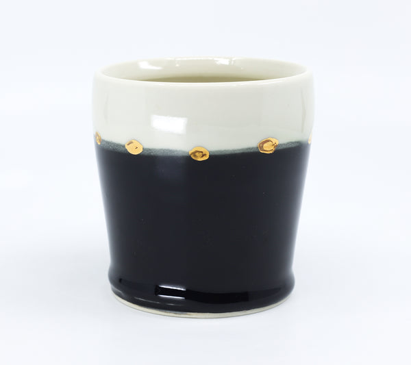 This is your perfect everyday cup for tea, juice, or a cocktail! I threw this cup on the wheel in porcelain, glazed it in a food safe glaze, and decorated it with 22K gold luster decals. It holds approximately 8 oz.