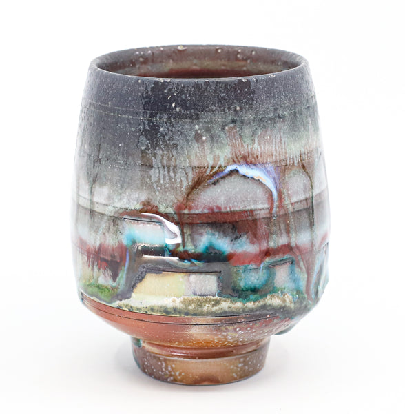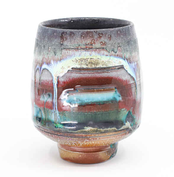 I threw this cup on the potters' wheel with b-mix clay, then hand carved it. I inlaid it with underglaze, decorated it with glaze, and soda fired it to cone 10.