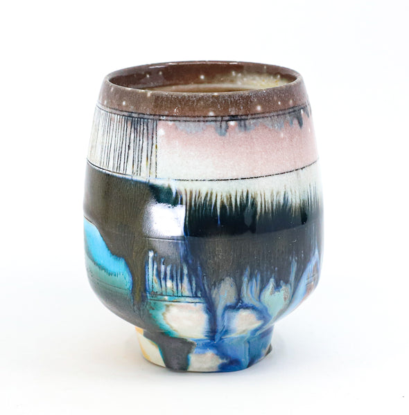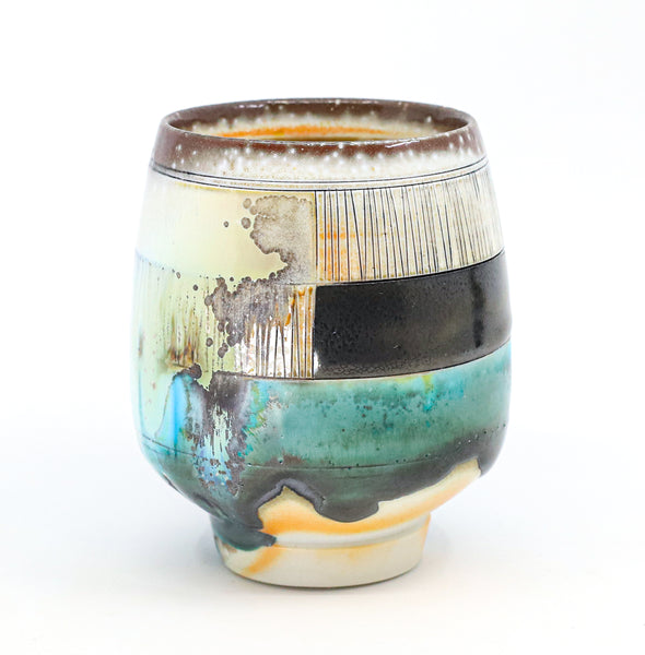 I threw this cup on the potters' wheel with porcelain, then hand carved it. I inlaid it with underglaze, decorated it with glaze, and soda fired it to cone 10.