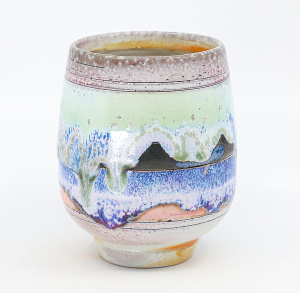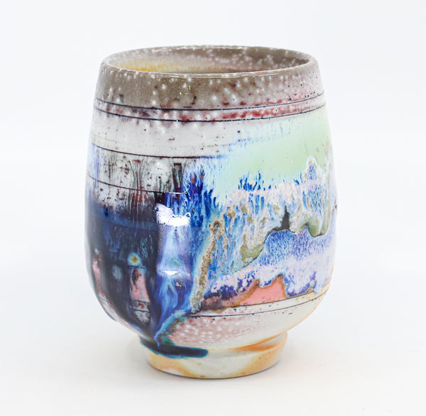 I threw this cup on the potters' wheel with porcelain, then hand carved it. I inlaid it with underglaze, decorated it with glaze, and soda fired it to cone 10.