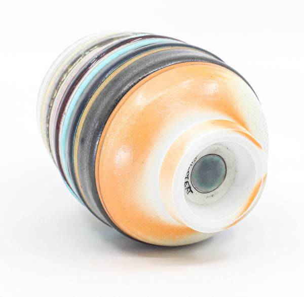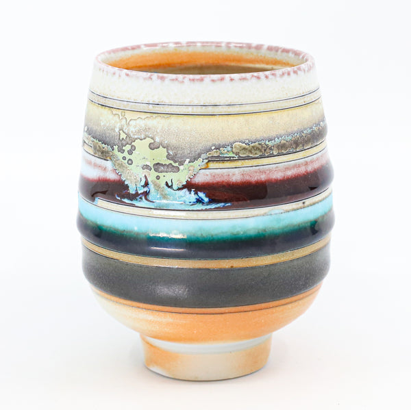 I threw this cup on the potters' wheel with porcelain, then hand carved it. I inlaid it with underglaze, decorated it with glaze, and soda fired it to cone 10.