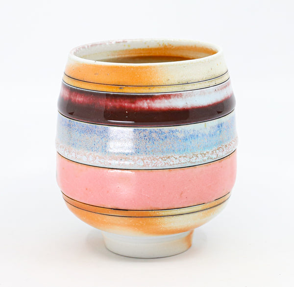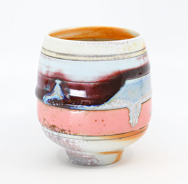 I threw this cup on the potters' wheel with porcelain, then hand carved it. I inlaid it with underglaze, decorated it with glaze, and soda fired it to cone 10.