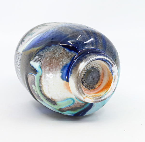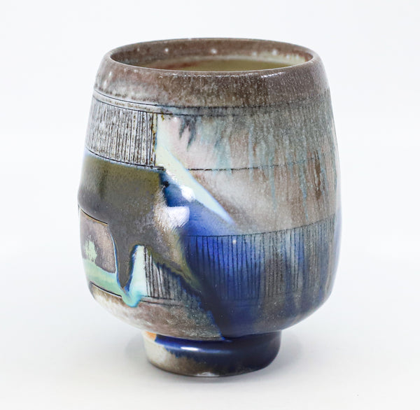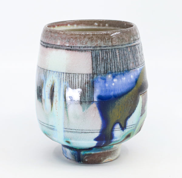 I threw this cup on the potters' wheel with porcelain, then hand carved it. I inlaid it with underglaze, decorated it with glaze, and soda fired it to cone 10.