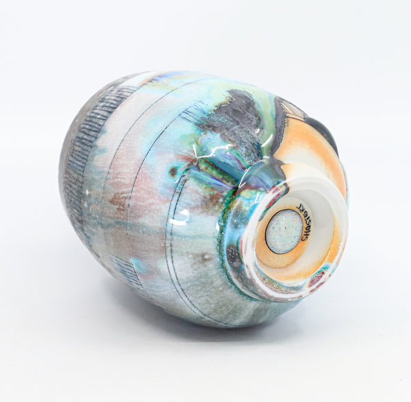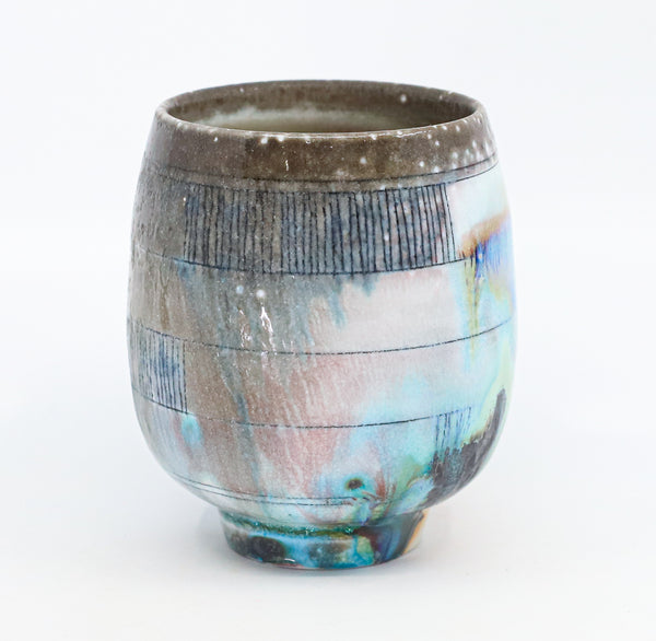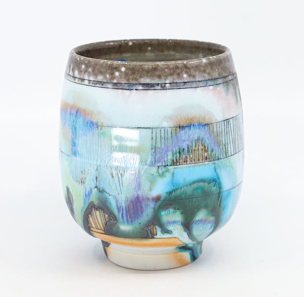 I threw this cup on the potters' wheel with porcelain, then hand carved it. I inlaid it with underglaze, decorated it with glaze, and soda fired it to cone 10.
