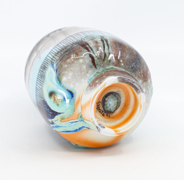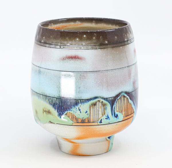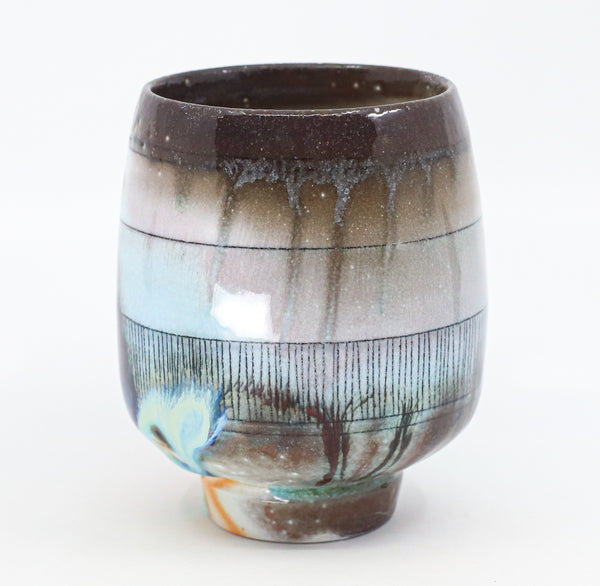 I threw this cup on the potters' wheel with porcelain, then hand carved it. I inlaid it with underglaze, decorated it with glaze, and soda fired it to cone 10.