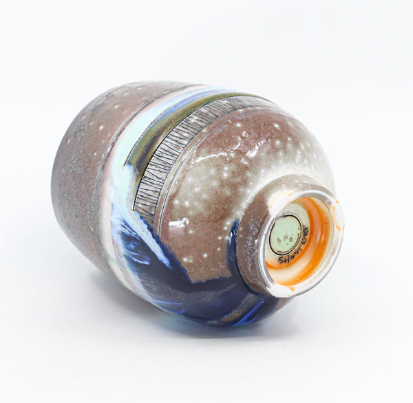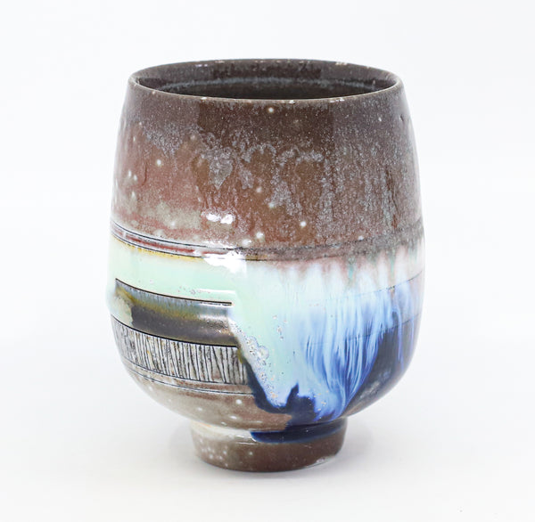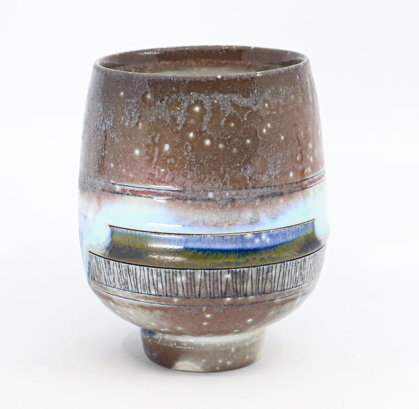 I threw this cup on the potters' wheel with porcelain, then hand carved it. I inlaid it with underglaze, decorated it with glaze, and soda fired it to cone 10.