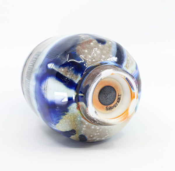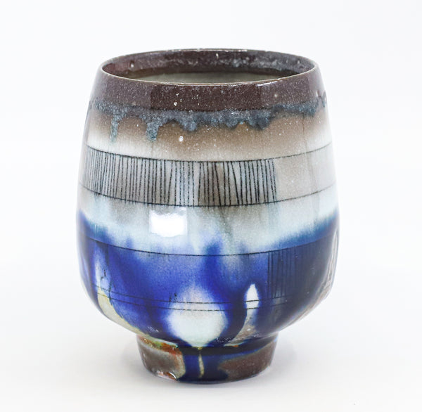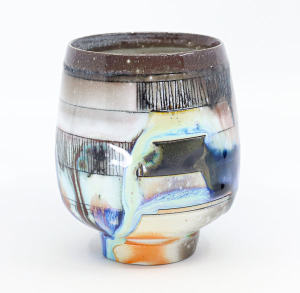 I threw this cup on the potters' wheel with porcelain, then hand carved it. I inlaid it with underglaze, decorated it with glaze, and soda fired it to cone 10.
