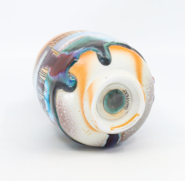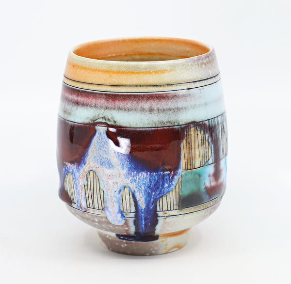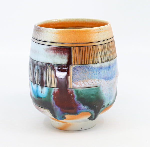 I threw this cup on the potters' wheel with porcelain, then hand carved it. I inlaid it with underglaze, decorated it with glaze, and soda fired it to cone 10.