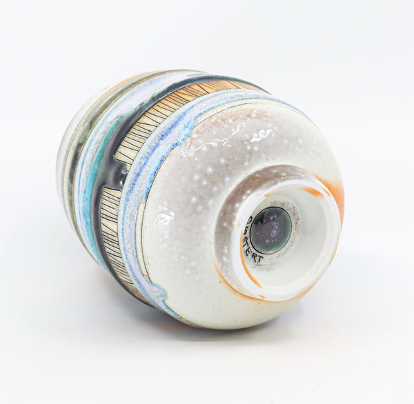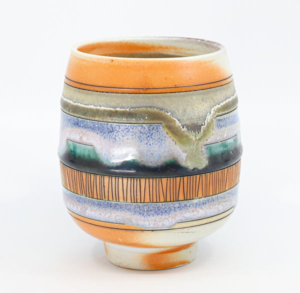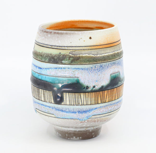 I threw this cup on the potters' wheel with porcelain, then hand carved it. I inlaid it with underglaze, decorated it with glaze, and soda fired it to cone 10.