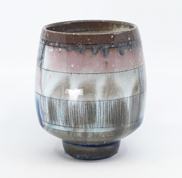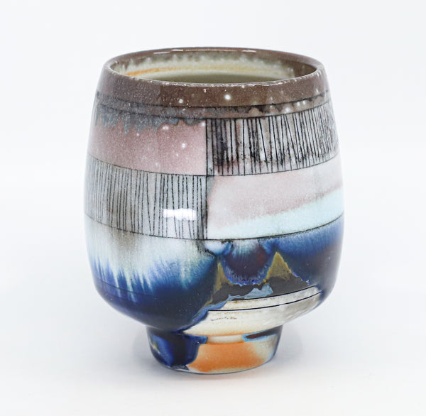I threw this cup on the potters' wheel with porcelain, then hand carved it. I inlaid it with underglaze, decorated it with glaze, and soda fired it to cone 10.