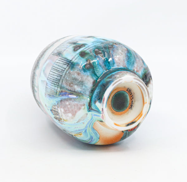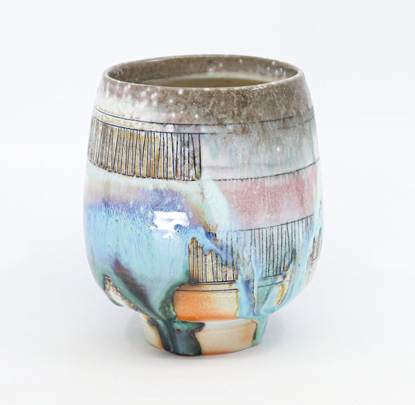 I threw this cup on the potters' wheel with porcelain, then hand carved it. I inlaid it with underglaze, decorated it with glaze, and soda fired it to cone 10.