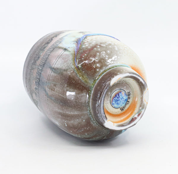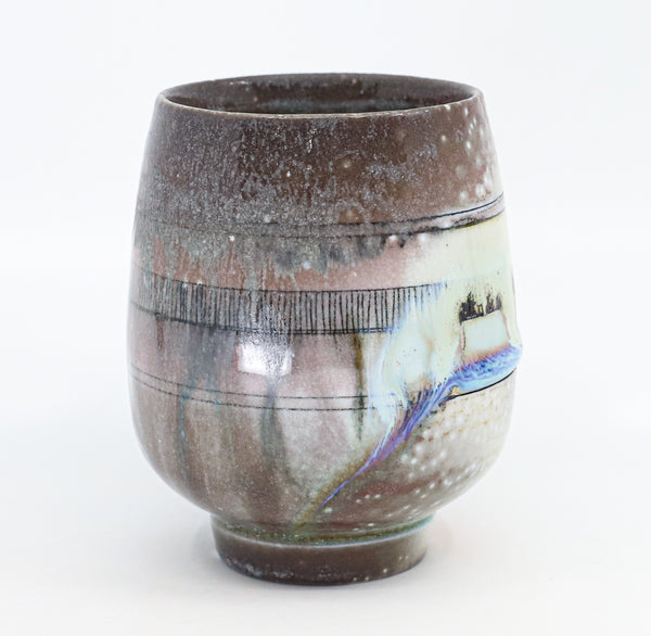 I threw this cup on the potters' wheel with porcelain, then hand carved it. I inlaid it with underglaze, decorated it with glaze, and soda fired it to cone 10.