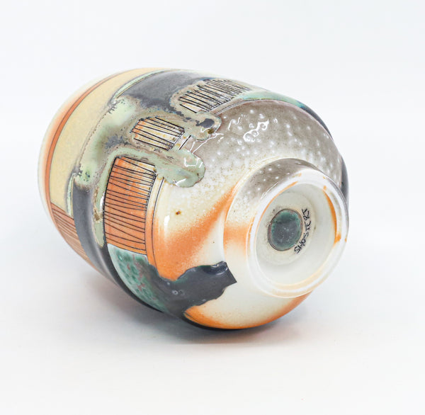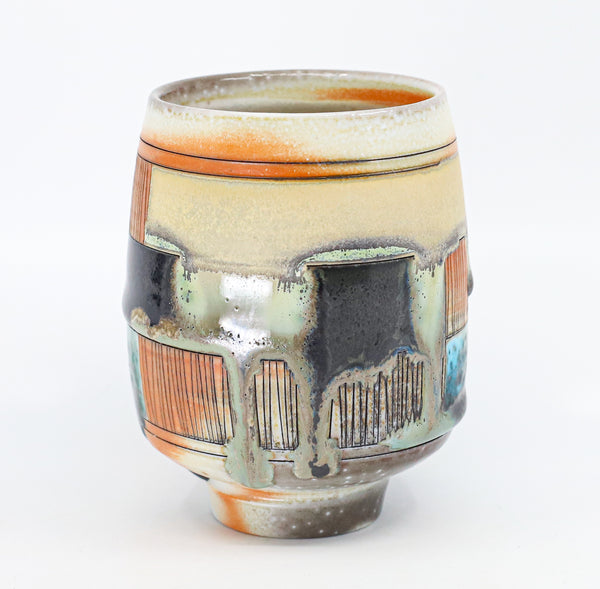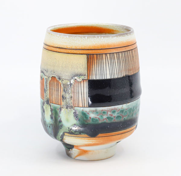 I threw this cup on the potters' wheel with porcelain, then hand carved it. I inlaid it with underglaze, decorated it with glaze, and soda fired it to cone 10.