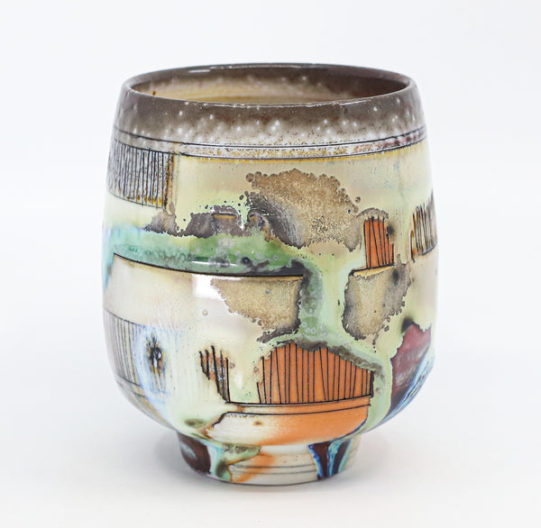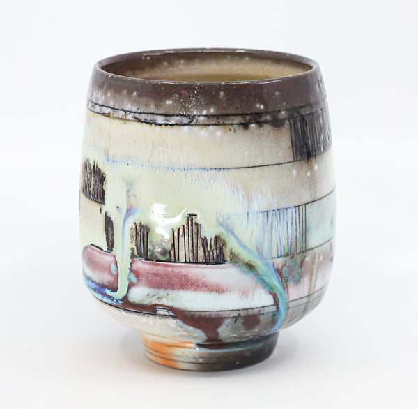 I threw this cup on the potters' wheel with porcelain, then hand carved it. I inlaid it with underglaze, decorated it with glaze, and soda fired it to cone 10.