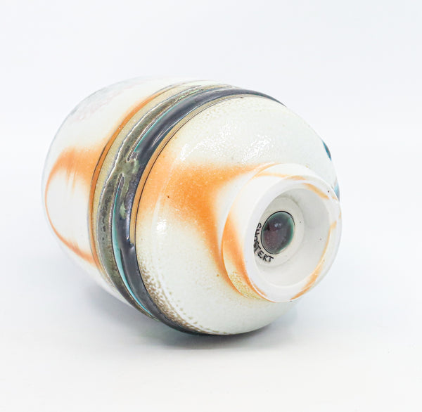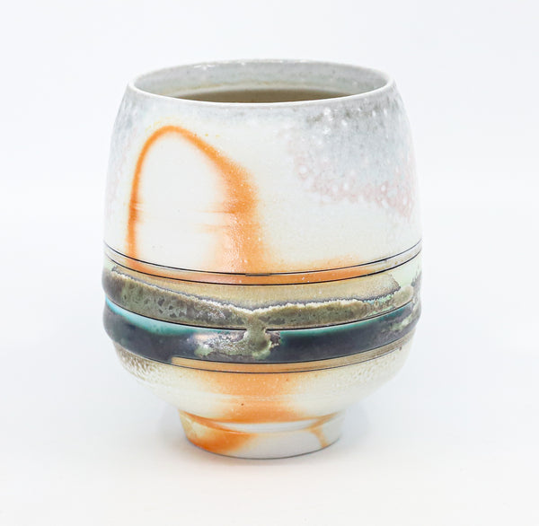 I threw this cup on the potters' wheel with porcelain, then hand carved it. I inlaid it with underglaze, decorated it with glaze, and soda fired it to cone 10.
