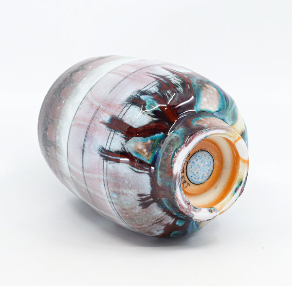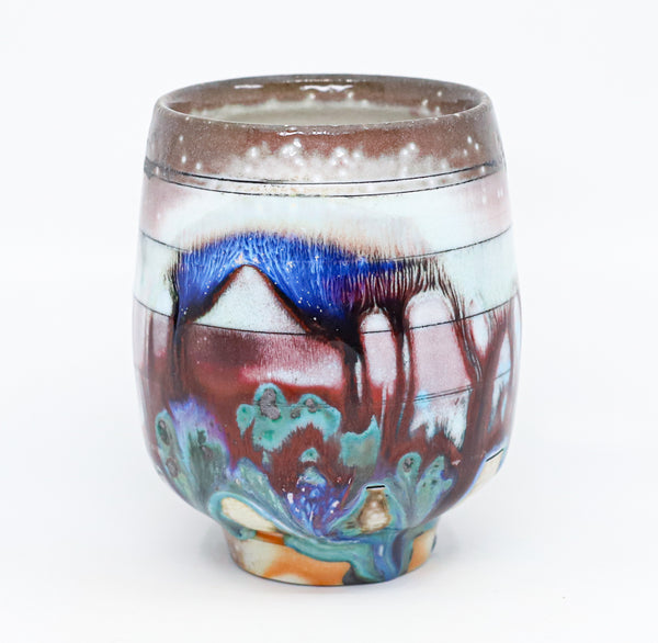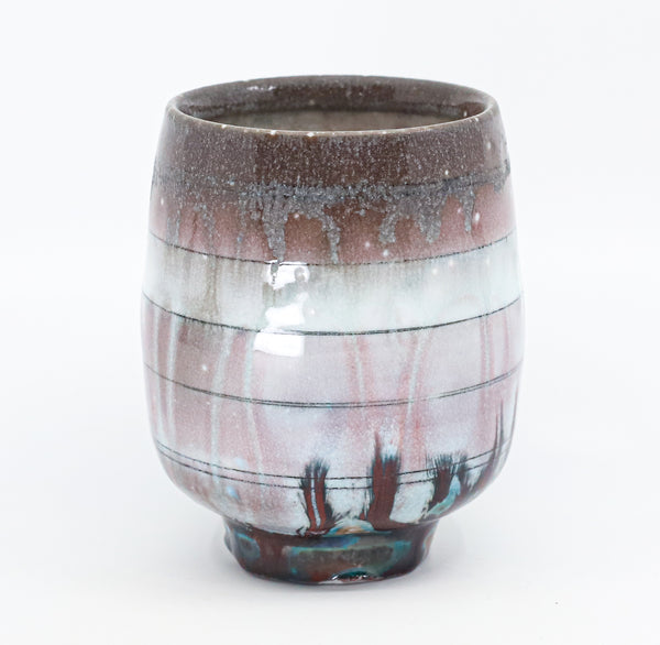 I threw this cup on the potters' wheel with porcelain, then hand carved it. I inlaid it with underglaze, decorated it with glaze, and soda fired it to cone 10.