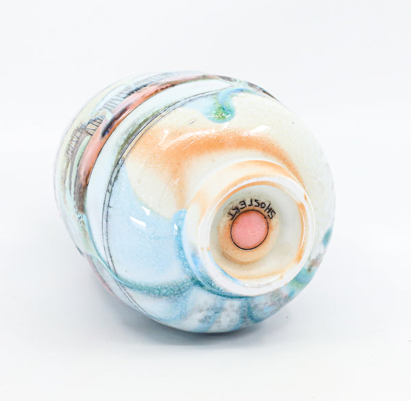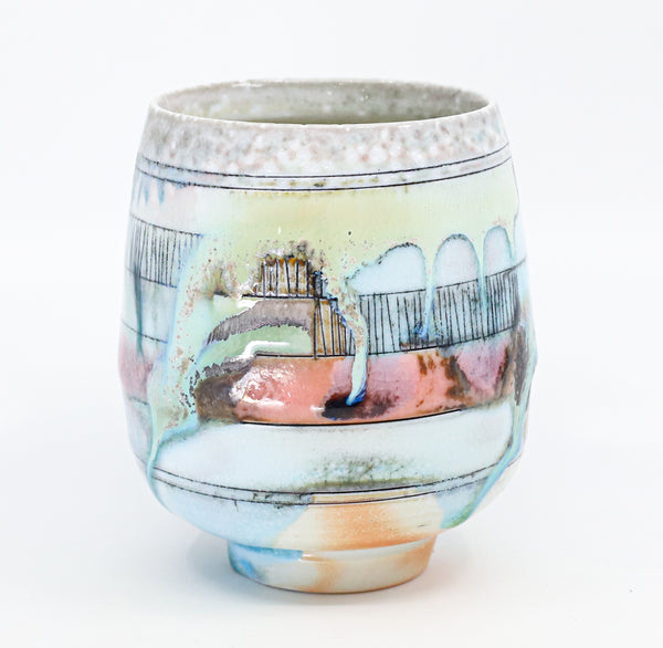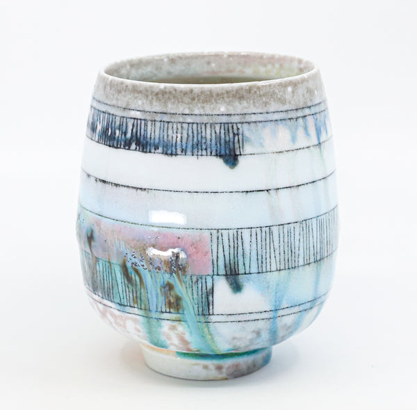 I threw this cup on the potters' wheel with porcelain, then hand carved it. I inlaid it with underglaze, decorated it with glaze, and soda fired it to cone 10.