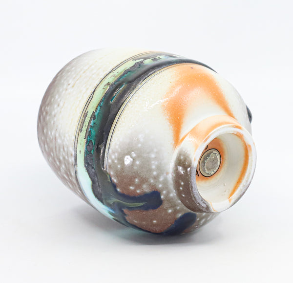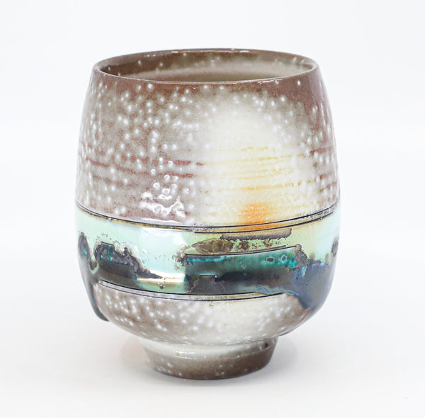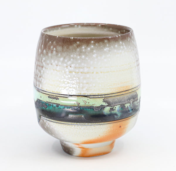 I threw this cup on the potters' wheel with porcelain, then hand carved it. I inlaid it with underglaze, decorated it with glaze, and soda fired it to cone 10.