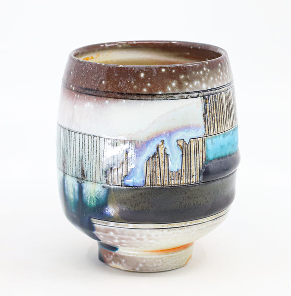 I threw this cup on the potters' wheel with porcelain, then hand carved it. I inlaid it with underglaze, decorated it with glaze, and soda fired it to cone 10.