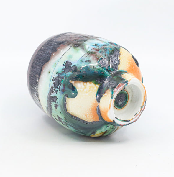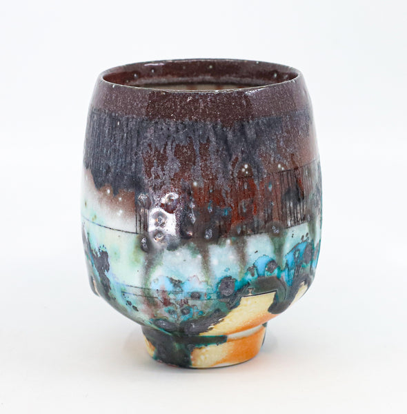 I threw this cup on the potters' wheel with porcelain, then hand carved it. I inlaid it with underglaze, decorated it with glaze, and soda fired it to cone 10.