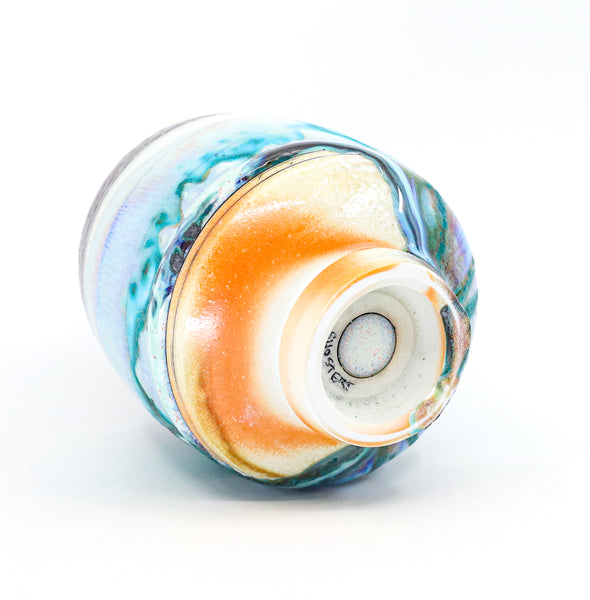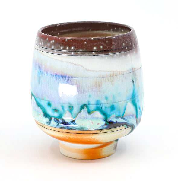 I threw this cup on the potters' wheel with porcelain, then hand carved it. I inlaid it with underglaze, decorated it with glaze, and soda fired it to cone 10.