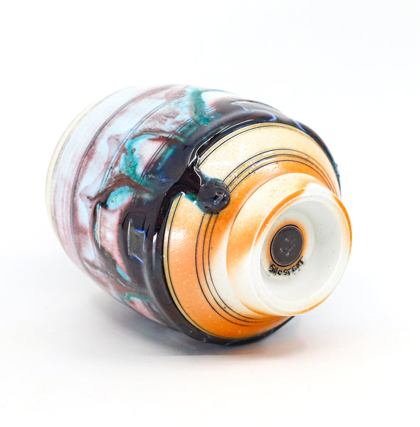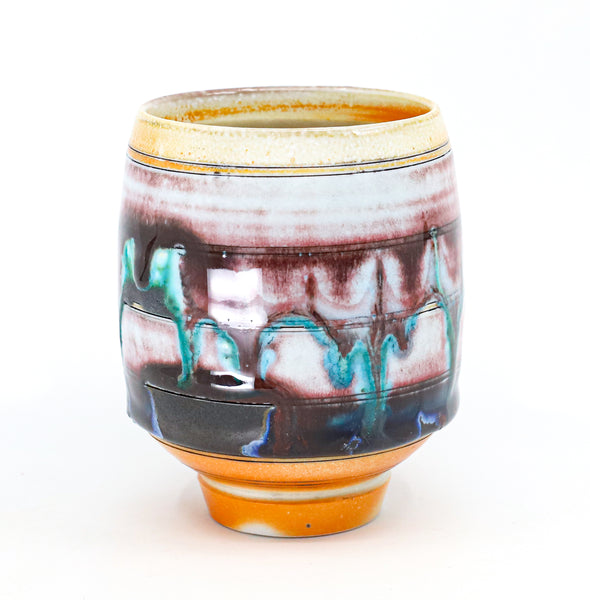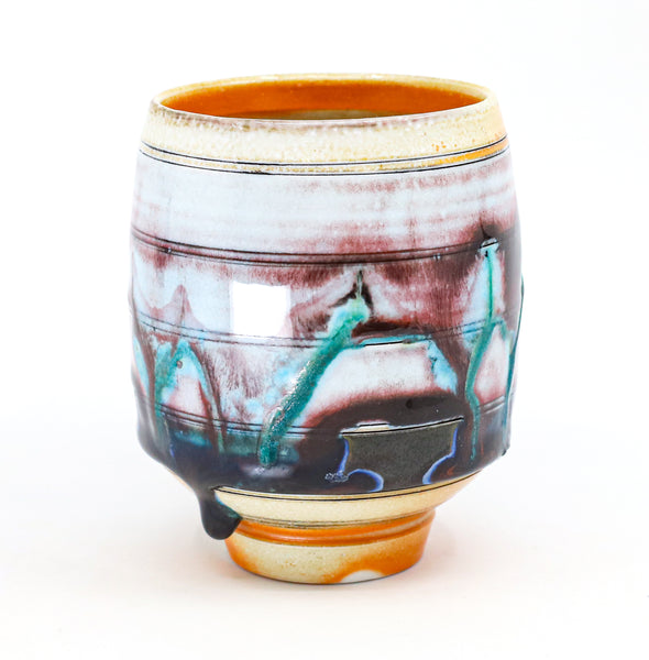 I threw this cup on the potters' wheel with porcelain, then hand carved it. I inlaid it with underglaze, decorated it with glaze, and soda fired it to cone 10.