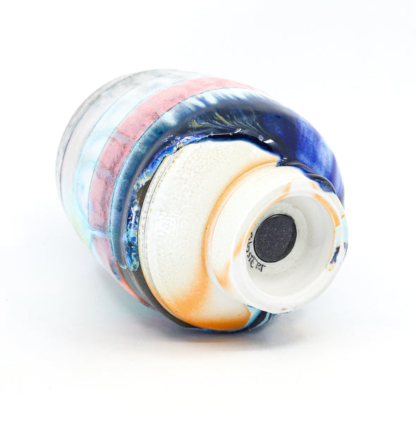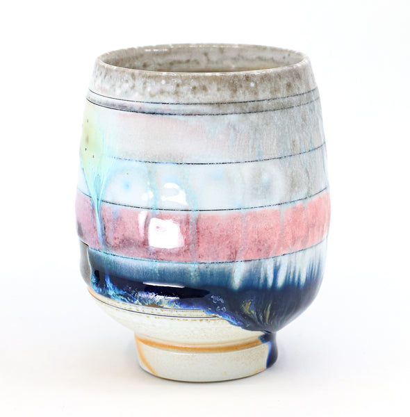 I threw this cup on the potters' wheel with porcelain, then hand carved it. I inlaid it with underglaze, decorated it with glaze, and soda fired it to cone 10.