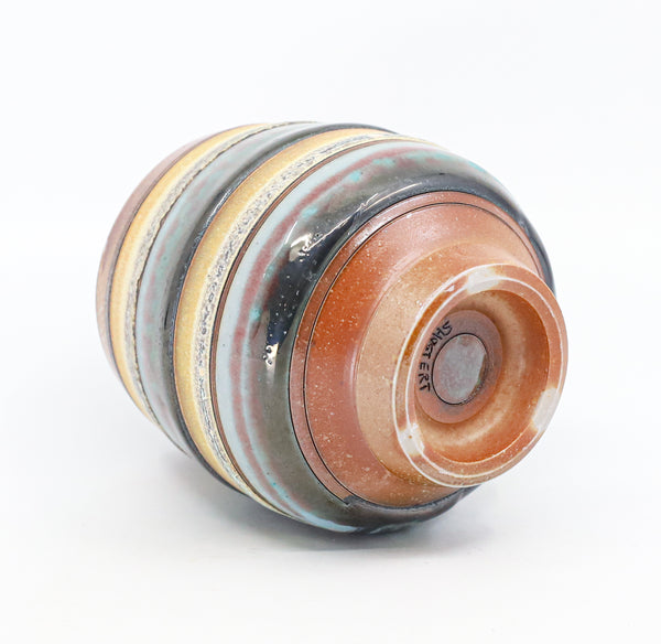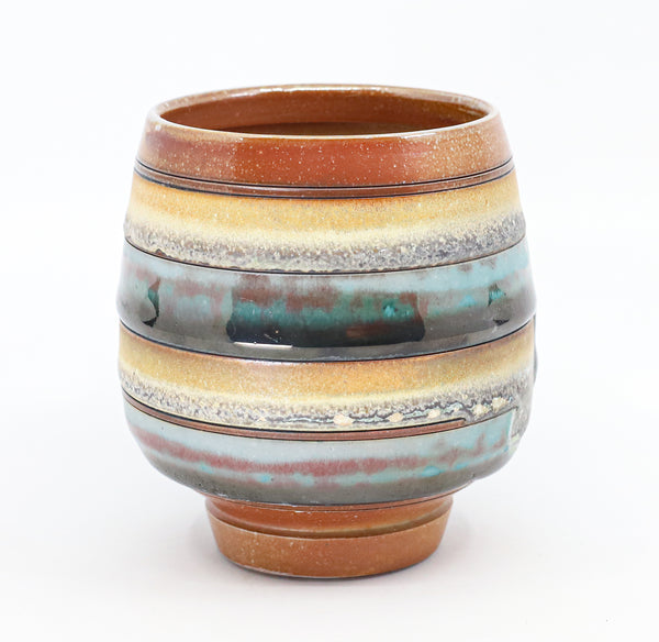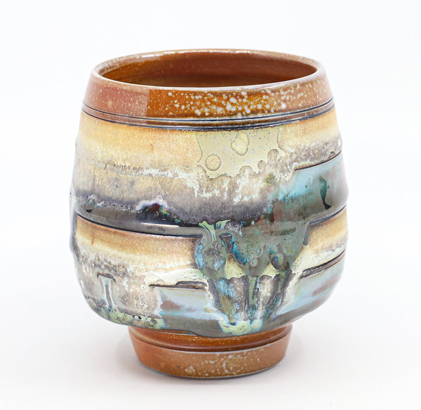 I threw this cup on the potters' wheel with b-mix clay, then hand carved it. I inlaid it with underglaze, decorated it with glaze, and soda fired it to cone 10.