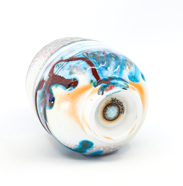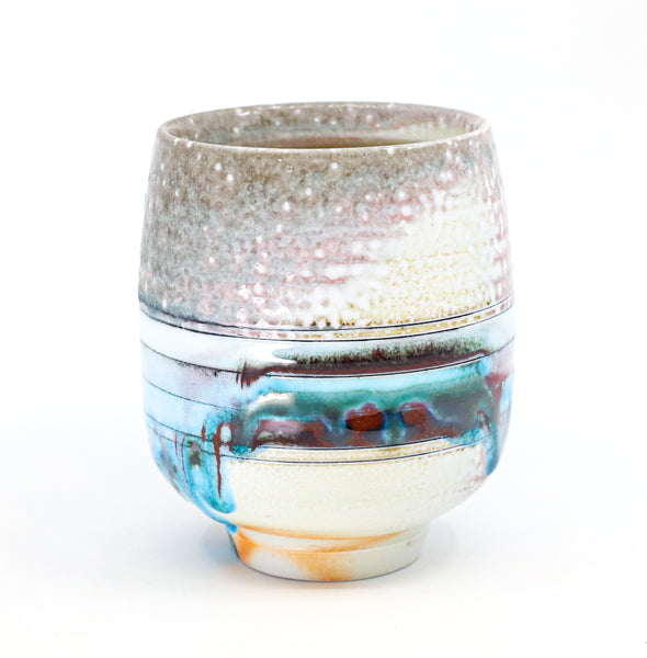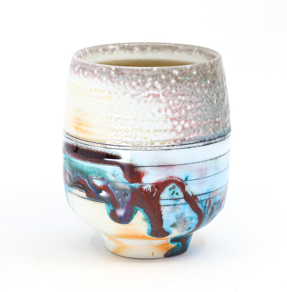 I threw this cup on the potters' wheel with porcelain, then hand carved it. I inlaid it with underglaze, decorated it with glaze, and soda fired it to cone 10.
