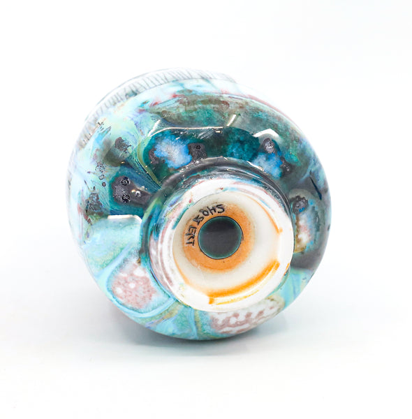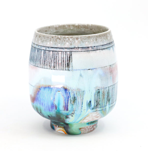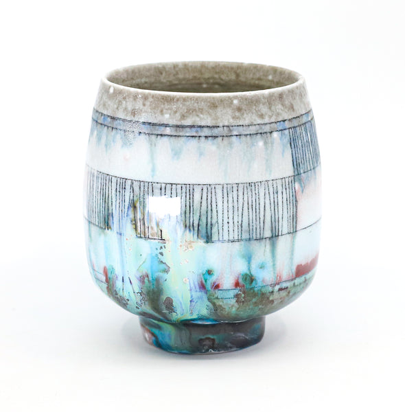 I threw this cup on the potters' wheel with porcelain, then hand carved it. I inlaid it with underglaze, decorated it with glaze, and soda fired it to cone 10.