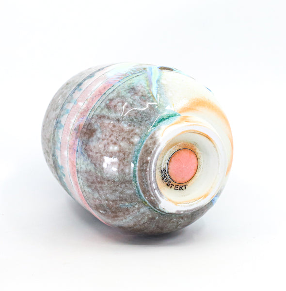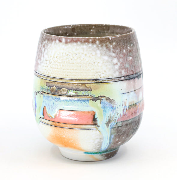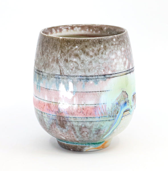 I threw this cup on the potters' wheel with porcelain, then hand carved it. I inlaid it with underglaze, decorated it with glaze, and soda fired it to cone 10.