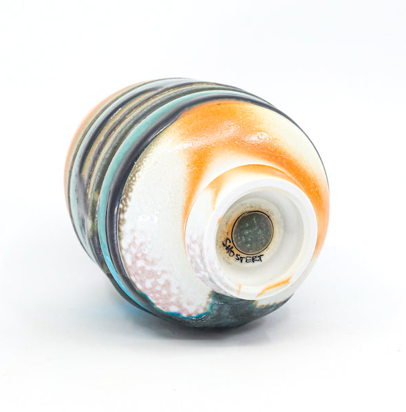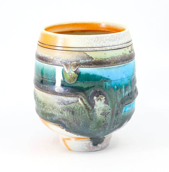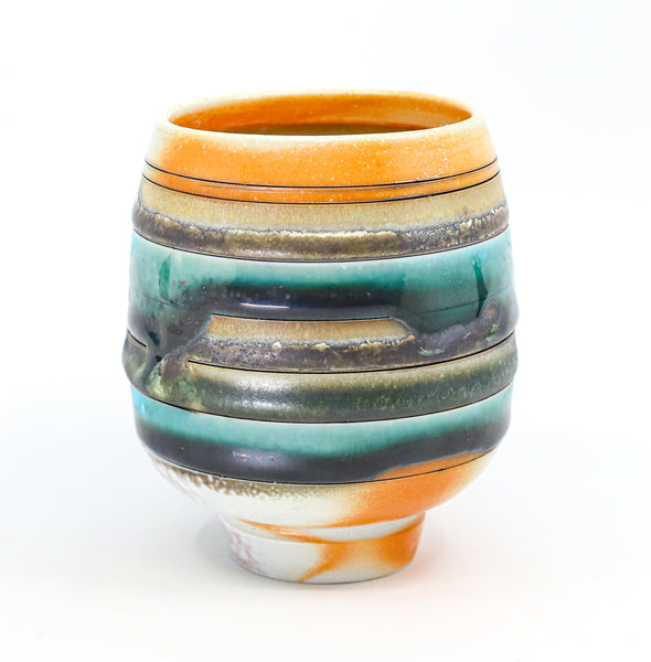 I threw this cup on the potters' wheel with porcelain, then hand carved it. I inlaid it with underglaze, decorated it with glaze, and soda fired it to cone 10.