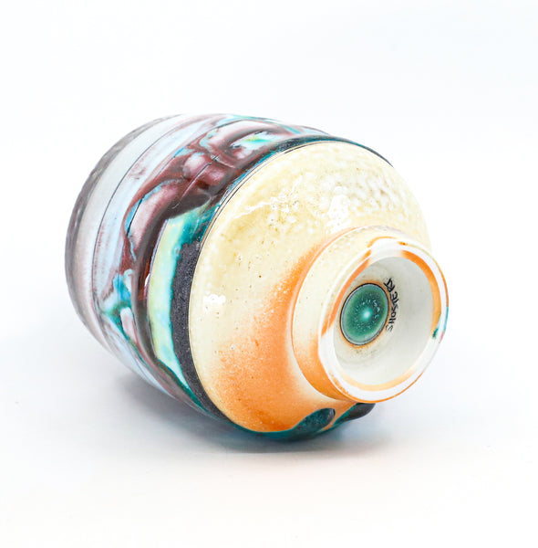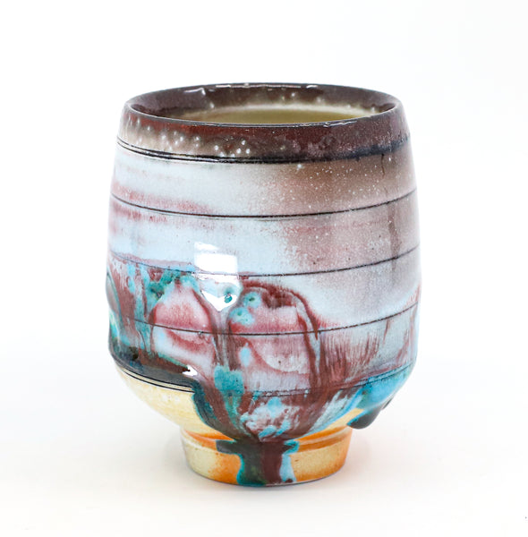 I threw this cup on the potters' wheel with porcelain, then hand carved it. I inlaid it with underglaze, decorated it with glaze, and soda fired it to cone 10.