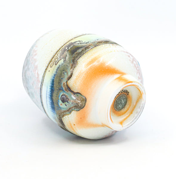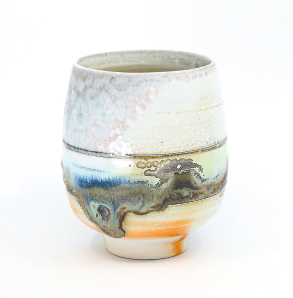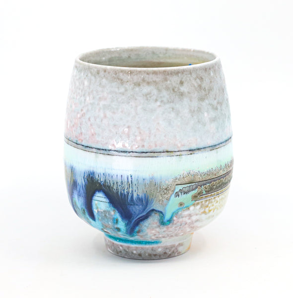 I threw this cup on the potters' wheel with porcelain, then hand carved it. I inlaid it with underglaze, decorated it with glaze, and soda fired it to cone 10.