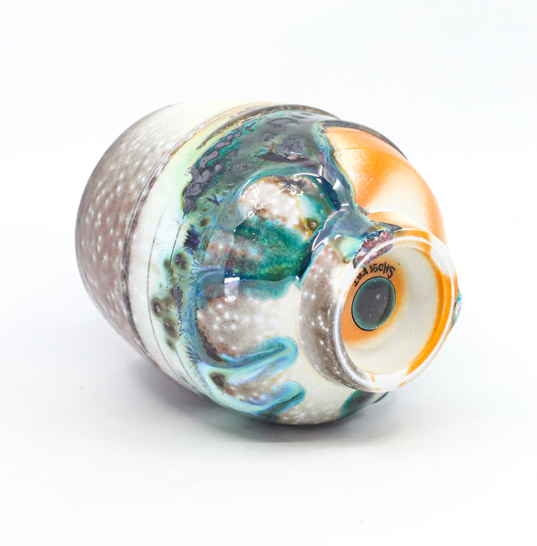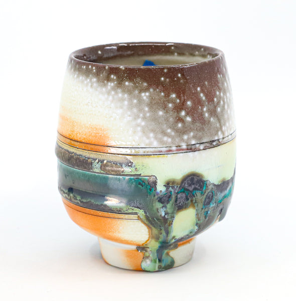 I threw this cup on the potters' wheel with porcelain, then hand carved it. I inlaid it with underglaze, decorated it with glaze, and soda fired it to cone 10.