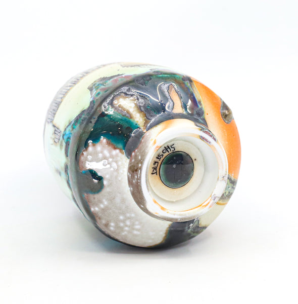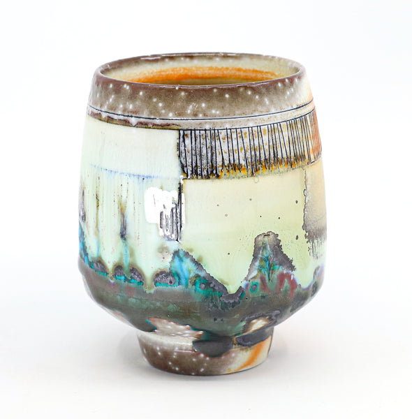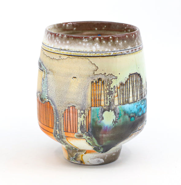 I threw this cup on the potters' wheel with porcelain, then hand carved it. I inlaid it with underglaze, decorated it with glaze, and soda fired it to cone 10.