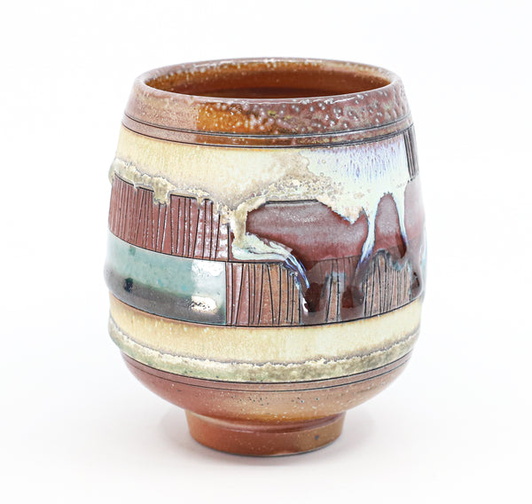 I threw this cup on the potters' wheel with b-mix clay, then hand carved it. I inlaid it with underglaze, decorated it with glaze, and soda fired it to cone 10.
