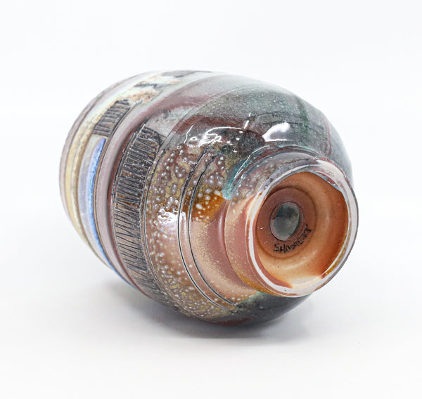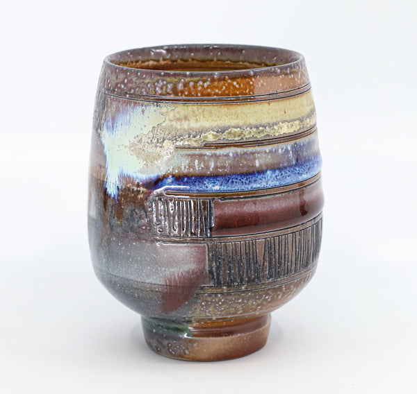 I threw this cup on the potters' wheel with b-mix clay, then hand carved it. I inlaid it with underglaze, decorated it with glaze, and soda fired it to cone 10.