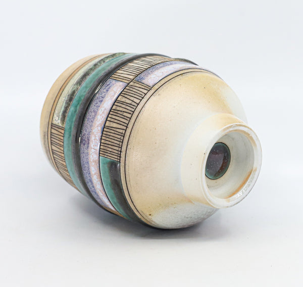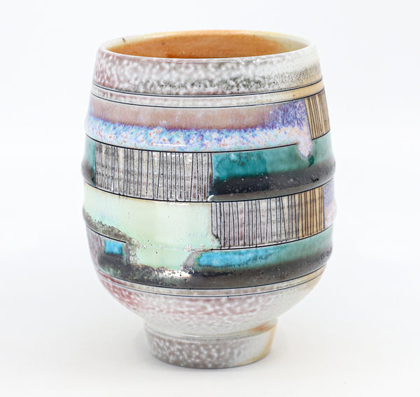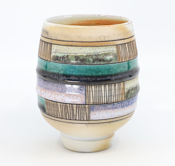 I threw this cup on the potters' wheel with porcelain, then hand carved it. I inlaid it with underglaze, decorated it with glaze, and soda fired it to cone 10.