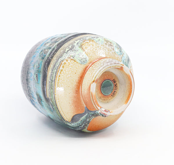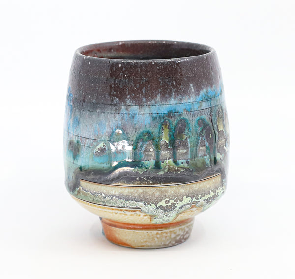 I threw this cup on the potters' wheel with porcelain, then hand carved it. I inlaid it with underglaze, decorated it with glaze, and soda fired it to cone 10.