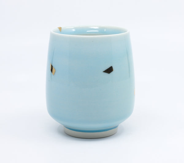 This is your perfect everyday cup for tea, juice, or a cocktail! I threw this cup on the wheel in porcelain, glazed it in a food safe glaze, and decorated it with 22K gold luster decals. It holds approximately 8 oz.