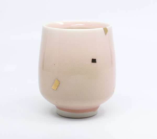 This is your perfect everyday cup for tea, juice, or a cocktail! I threw this cup on the wheel in porcelain, glazed it in a food safe glaze, and decorated it with 22K gold luster decals. It holds approximately 8 oz.