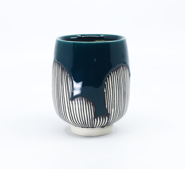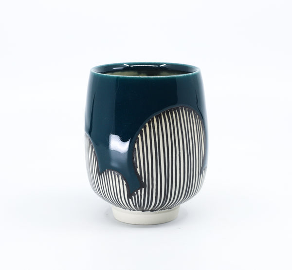 This cup* is perfect for your five o'clock cocktail, juice, tea or anything else you like to drink! I threw and trimmed the cup on the potters wheel. I then hand drew the design in black underglaze and glazed it in a food safe glaze.