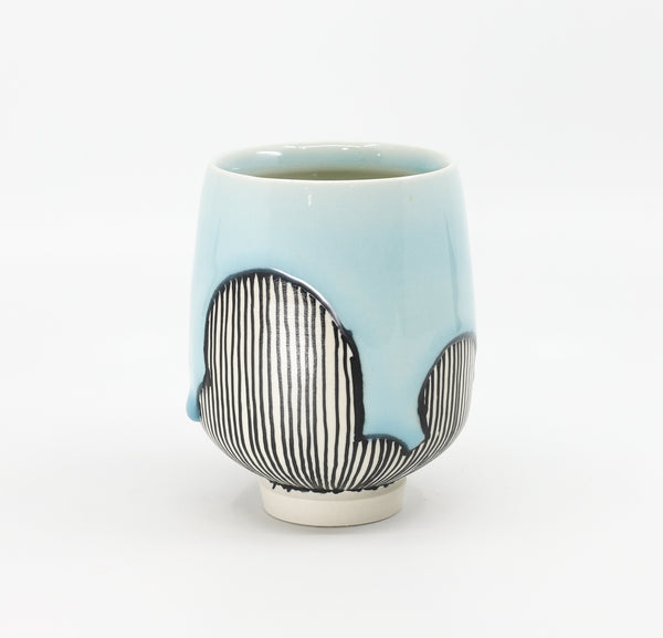 This cup is perfect for your five o'clock cocktail, juice, tea or anything else you like to drink! I threw and trimmed the cup on the potters wheel. I then hand drew the design in black underglaze. I painted wax over the drawings to resist the glaze and keep that area raw clay. I love the tactile feel of the raw clay next to the smooth glaze.