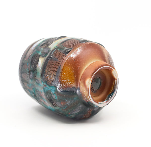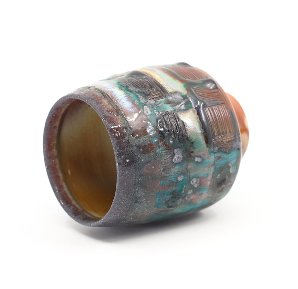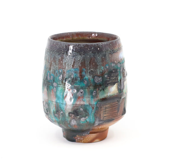 I threw this cup on the potter's wheel with b-mix clay. I decorated it with precise, controlled lines incised with an exacto knife, then inlaid with underglaze. I then carefully applied glaze within the lines before introducing it to the chaos of the soda kiln, where I fired it to cone 10.