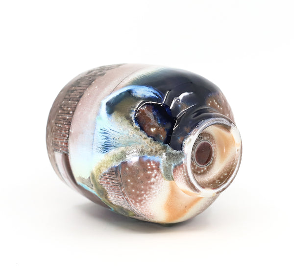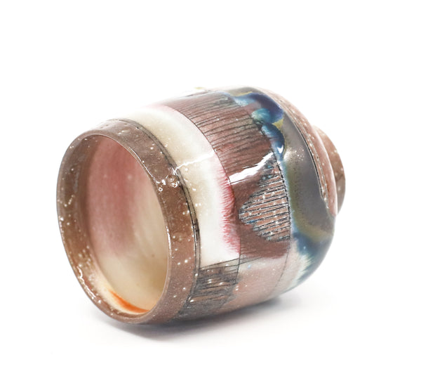 I threw this cup on the potter's wheel with porcelain. I decorated it with precise, controlled lines incised with an exacto knife, then inlaid with underglaze. I then carefully applied glaze within the lines before introducing it to the chaos of the soda kiln, where I fired it to cone 10.