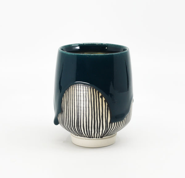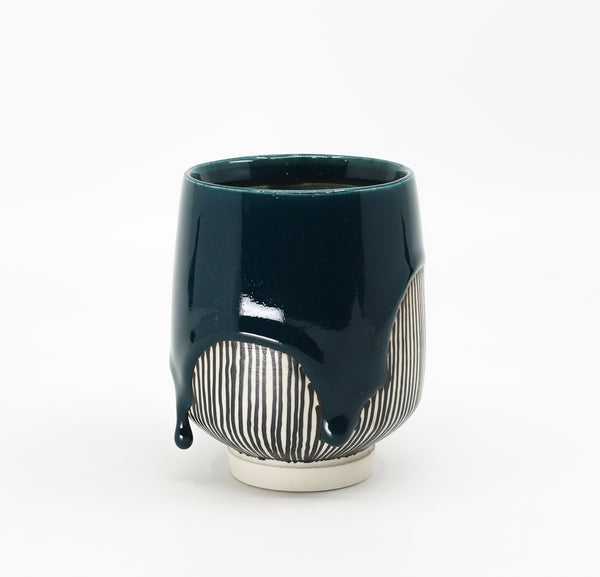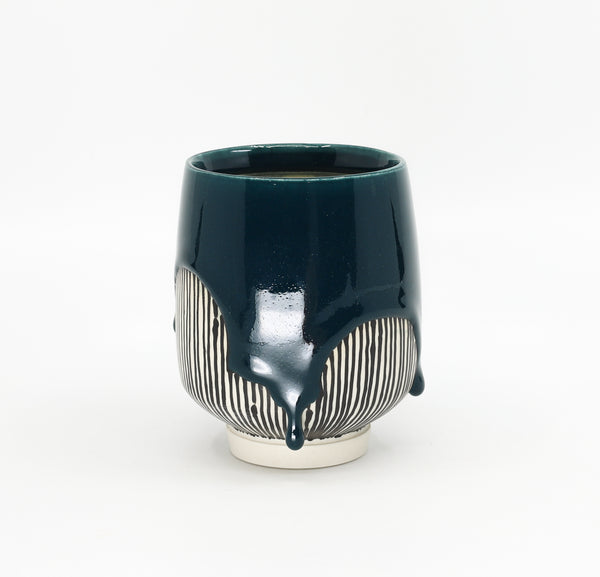 I glazed in peacock, a deep green glaze. The glaze ran a bit, and formed the perfect drip along one side of the cup! The drip is fragile, but beautiful.