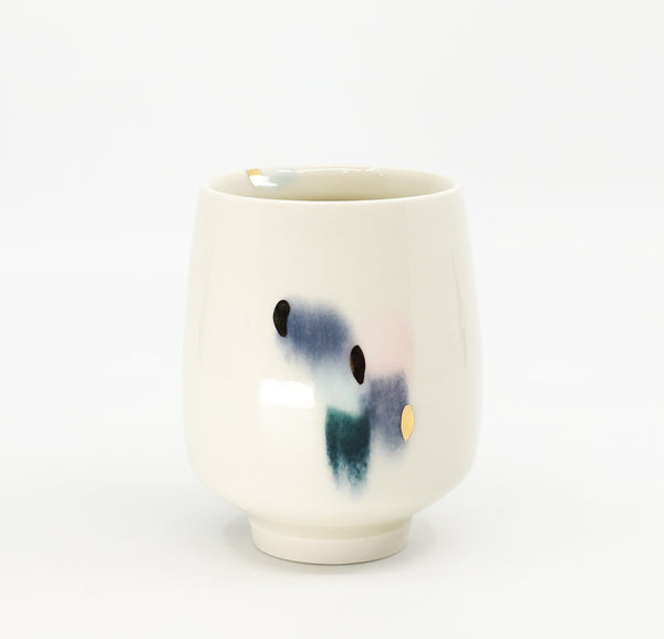 This cup is perfect for your five o'clock cocktail, juice, tea or anything else you like to drink! I threw and trimmed the cup on the potters wheel. I hand decorated it with glaze and fired it to cone 6. I then hand painted gold luster before firing it a third time.